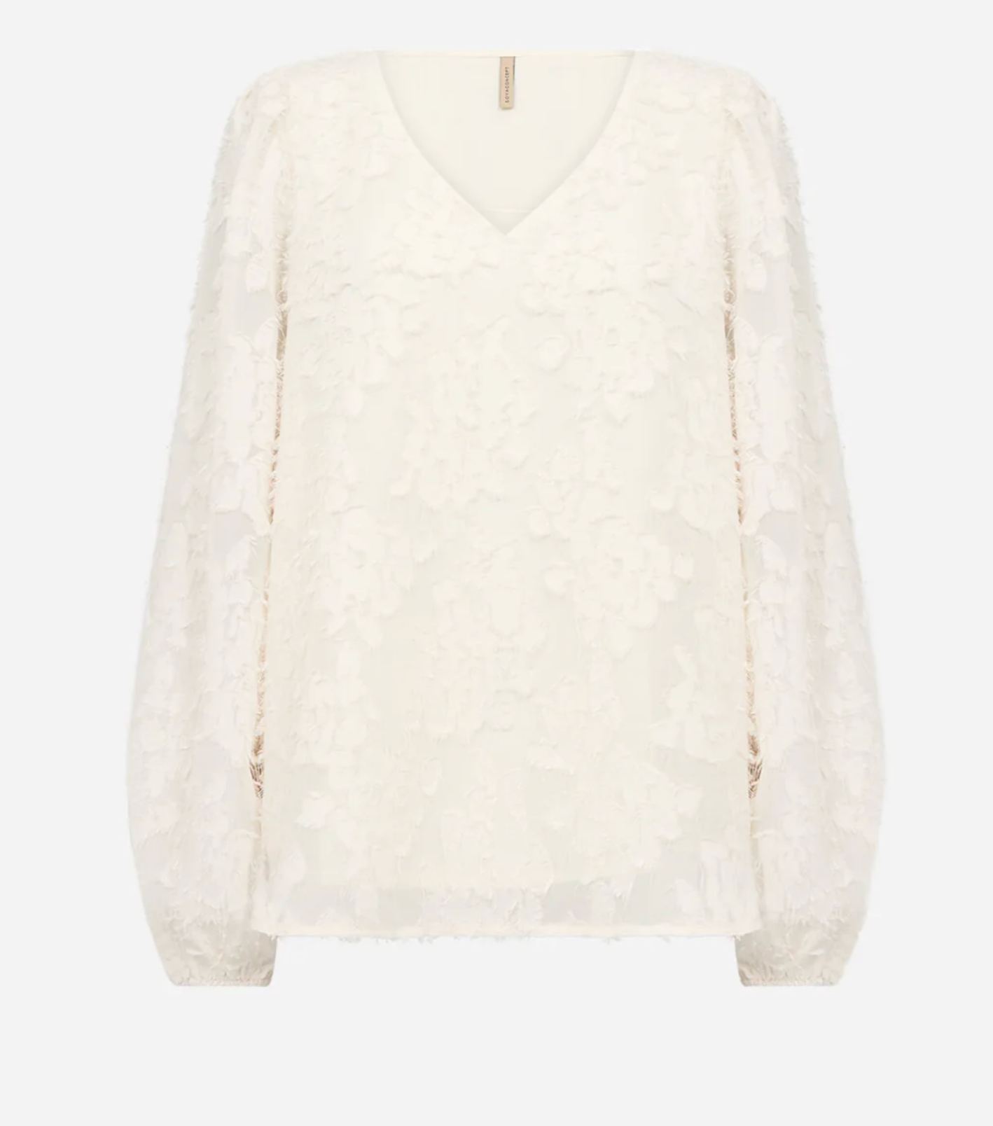 ALTHEA 2 Blouse is crafted from 100% recycled polyester. It features a delicate floral texture, a V-neckline, and long sleeves with elasticated cuffs. Pair it with tailored trousers or a sleek skirt for a refined look.