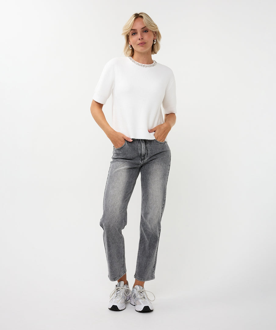 White short sleeve sweater with fancy neck line, cozy great for every day or dress up for the holidays
