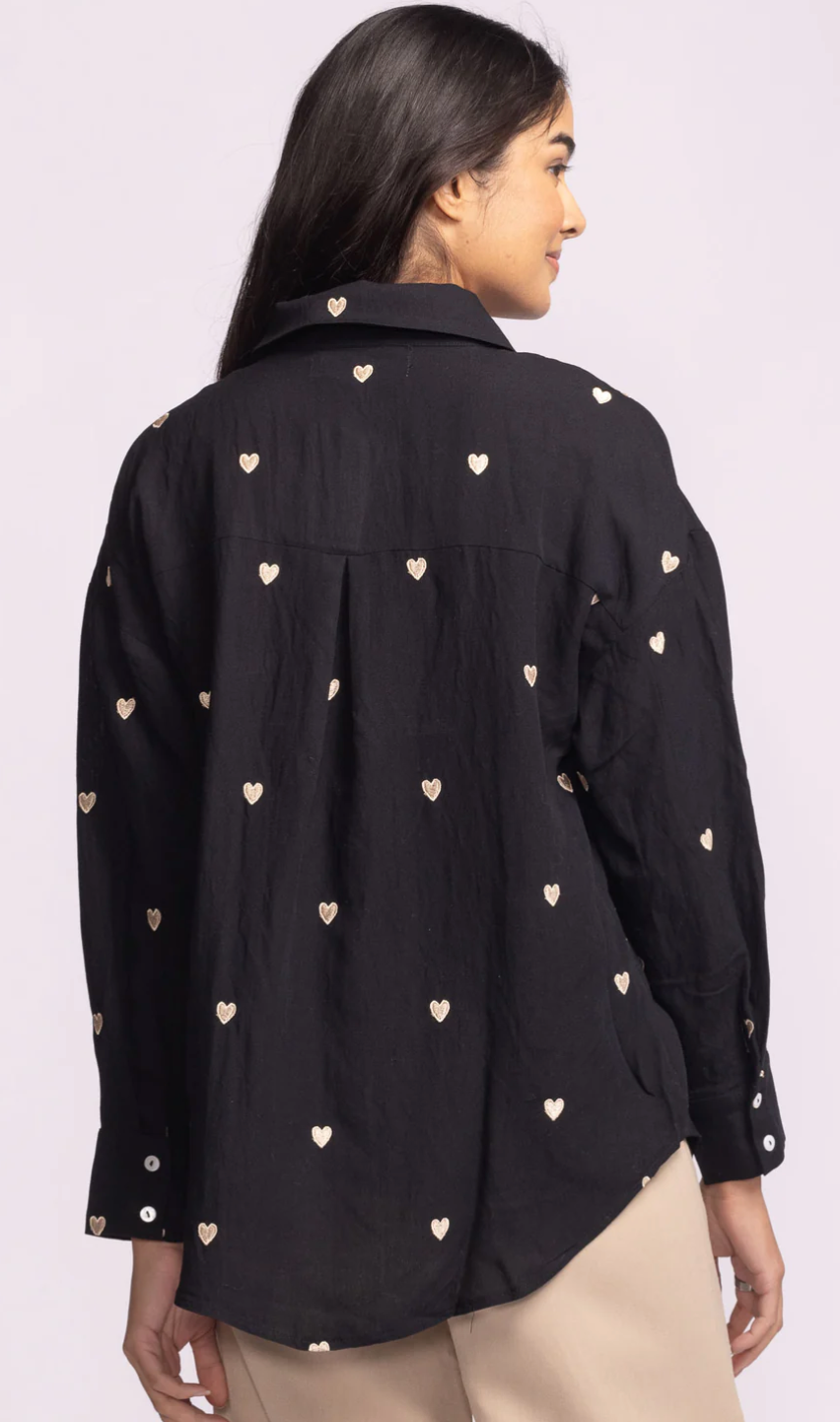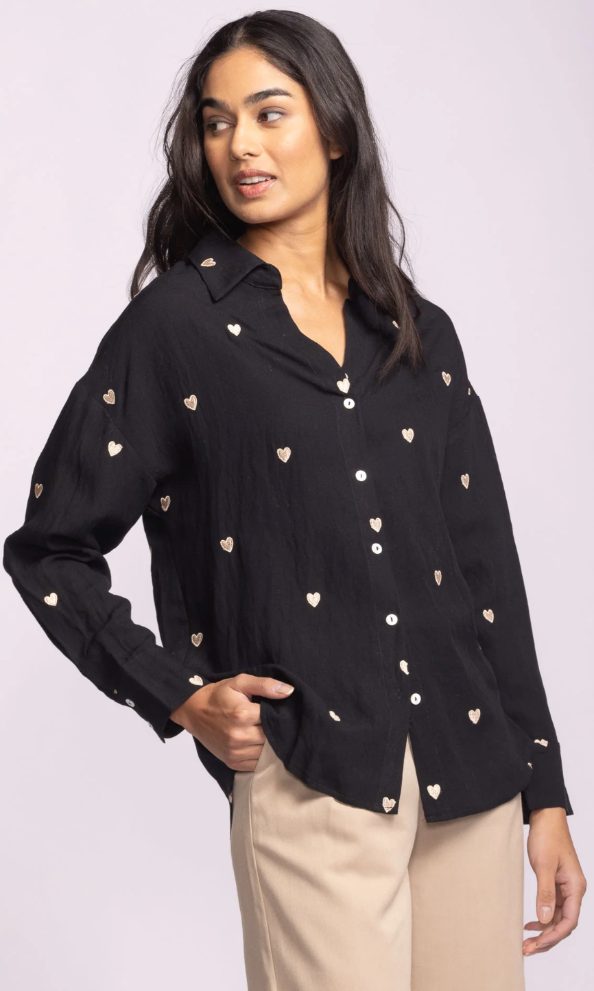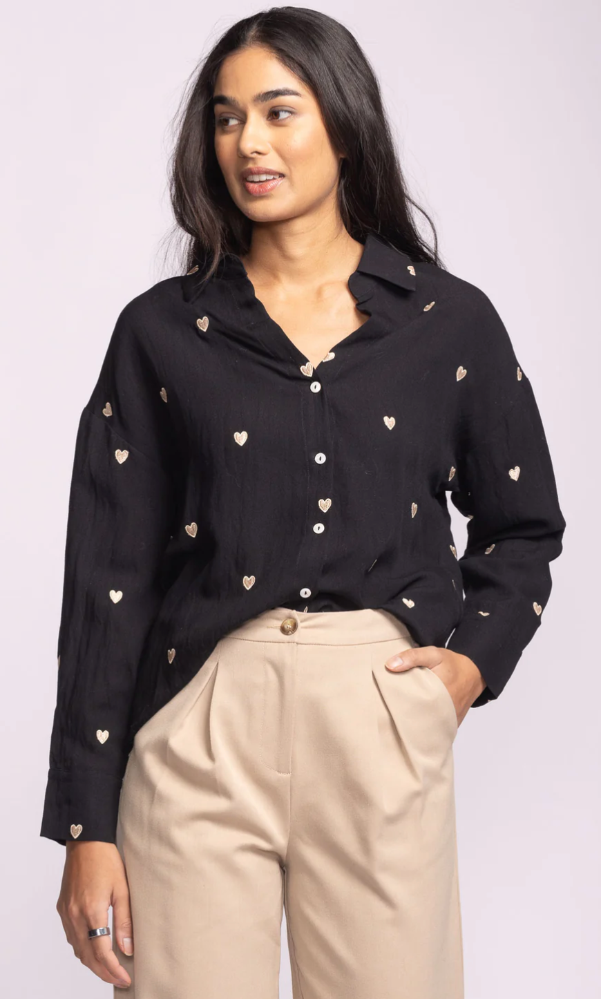 The Spezia Top is a button-up shirt detailed with dainty all-over embroidered hearts for a playful twist. Designed with a classic collar, V-neckline, and buttoned cuffs. Style it tucked into trousers or a skirt, perfect for taking your look from office hours to dinner plans