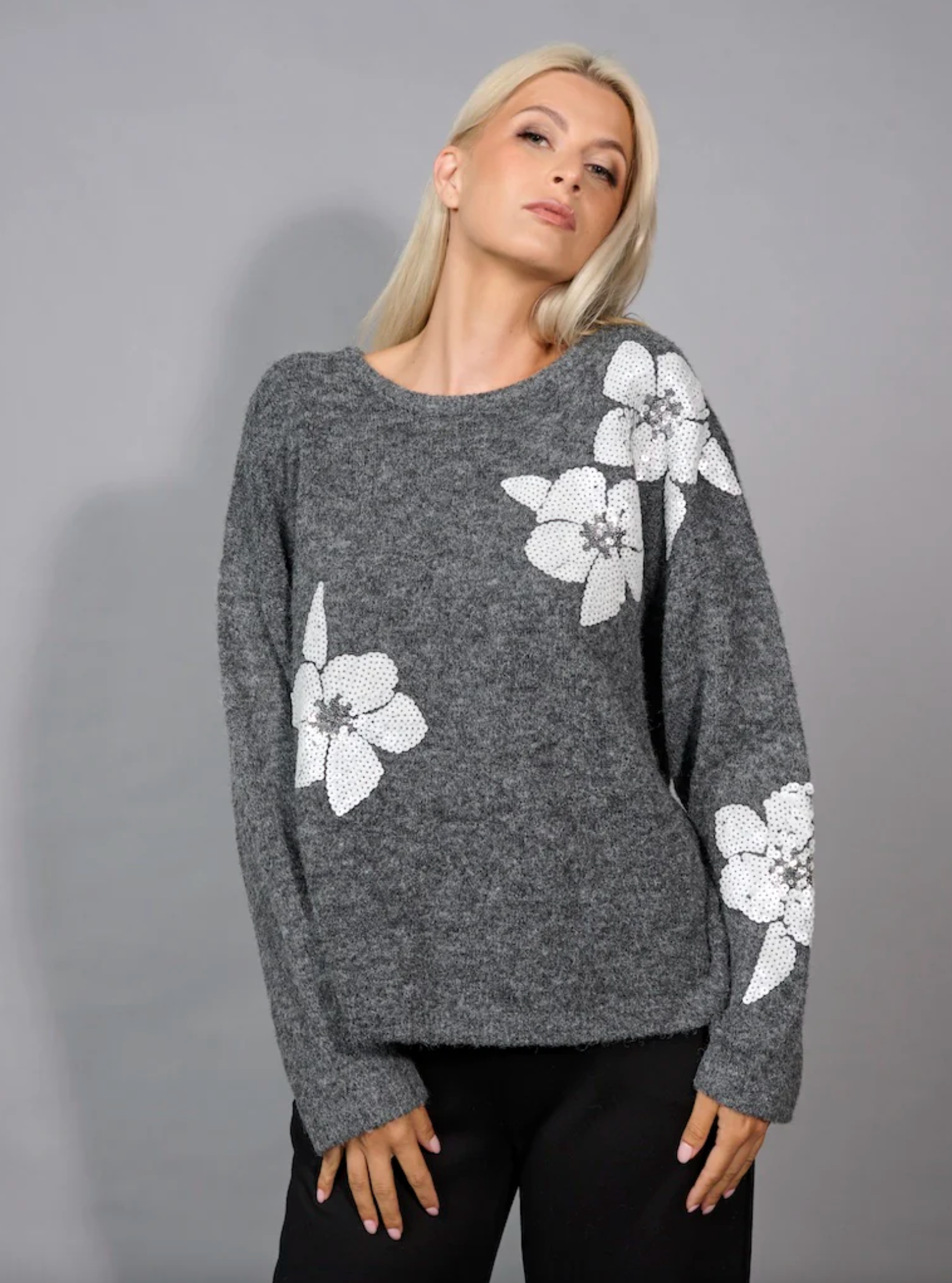 gray knit sweater features delicate sequin-embellished floral appliqués on the shoulder, sleeve, and front. Its comfortable fit and crew neck make it an easy-to-wear piece that instantly brightens up your everyday looks and weekend outings.