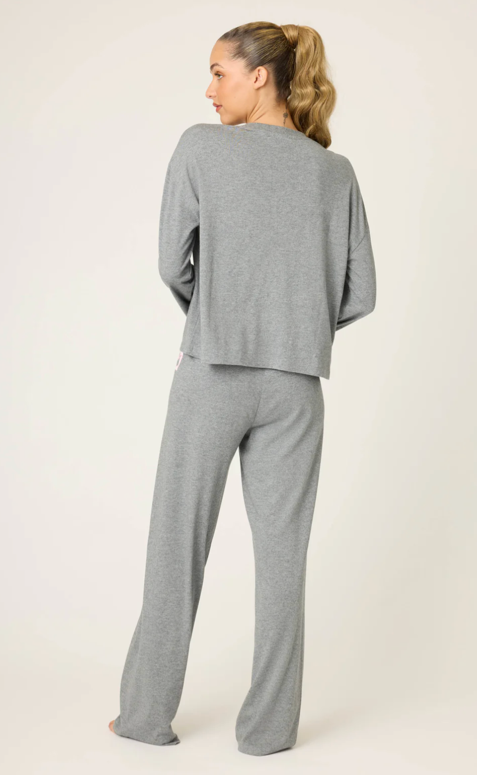 Celebrate cozy season in this grey pajama set, made from soft jersey with a cropped long sleeve top and relaxed drawstring pants. A sweet pink bow graphic makes it feel like the best gift under the tree—ideal for festive nights or lazy mornings.